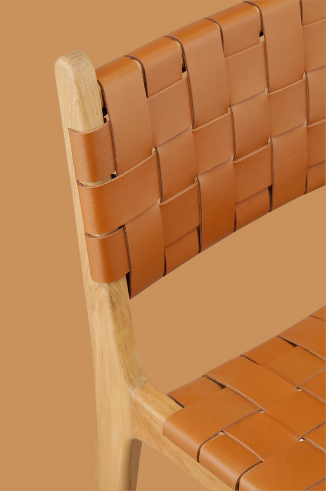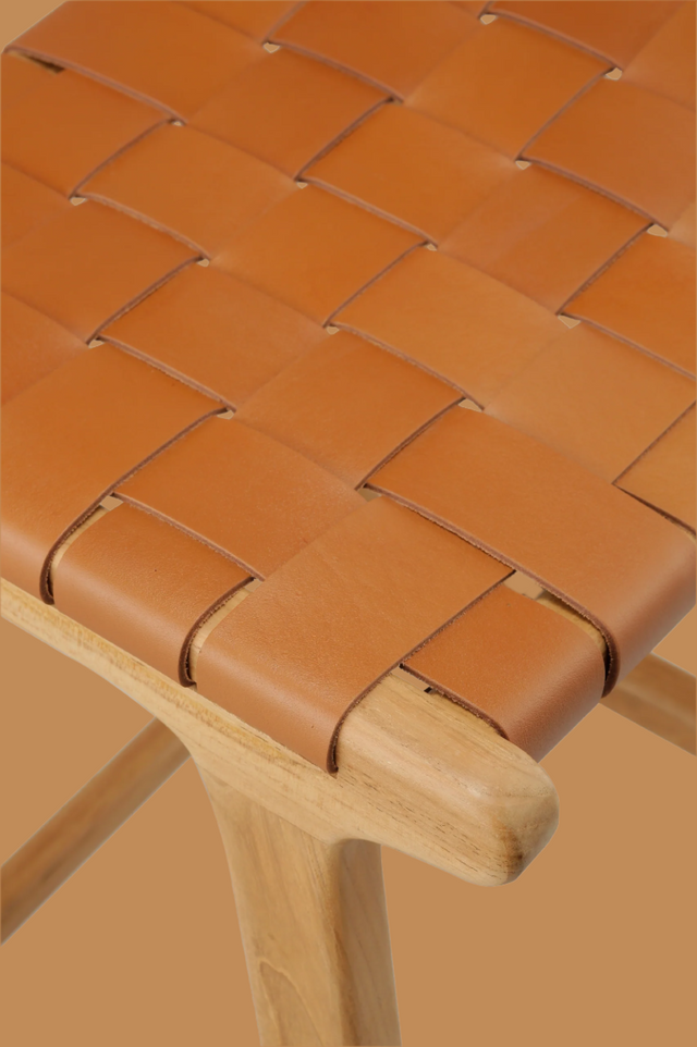 Highest grade sustainable teak, full grain vegetable tanned leather. Note: Leather features intentional contrast - smooth finished front, unfinished natural texture on back.