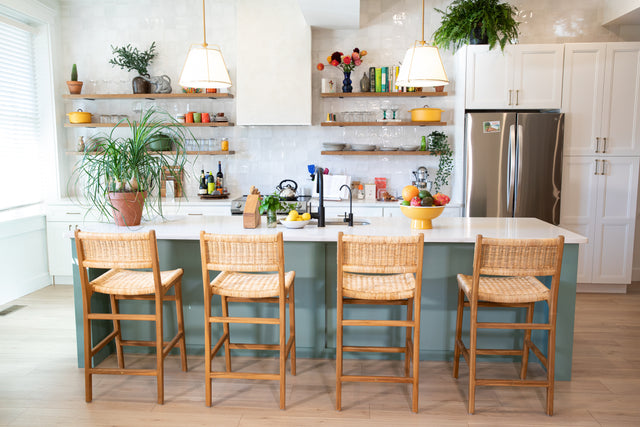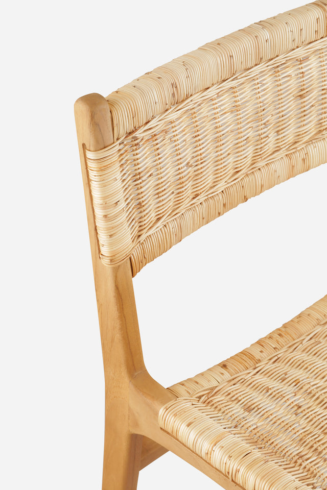 This sleek counter stool celebrates the remarkable strength of natural rattan, expertly hand-woven onto a solid teak frame. The clean, architectural lines create a silhouette that's both sophisticated and approachable—perfect for those who appreciate the subtle textures and warmth that natural materials bring to a space.