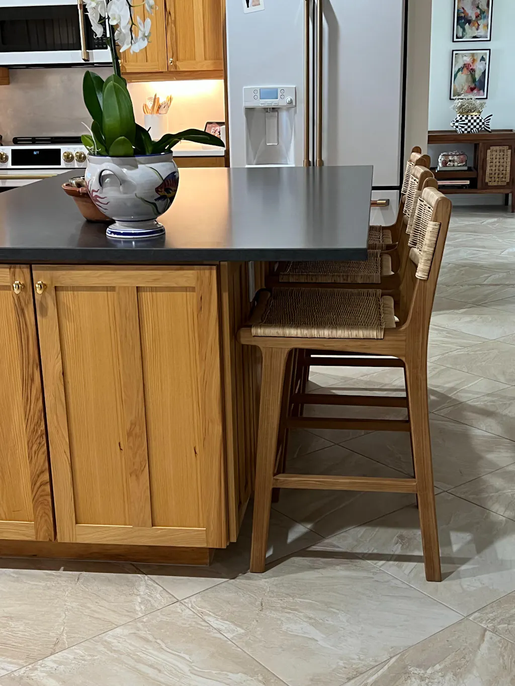 This sleek counter stool celebrates the remarkable strength of natural rattan, expertly hand-woven onto a solid teak frame. The clean, architectural lines create a silhouette that's both sophisticated and approachable—perfect for those who appreciate the subtle textures and warmth that natural materials bring to a space.